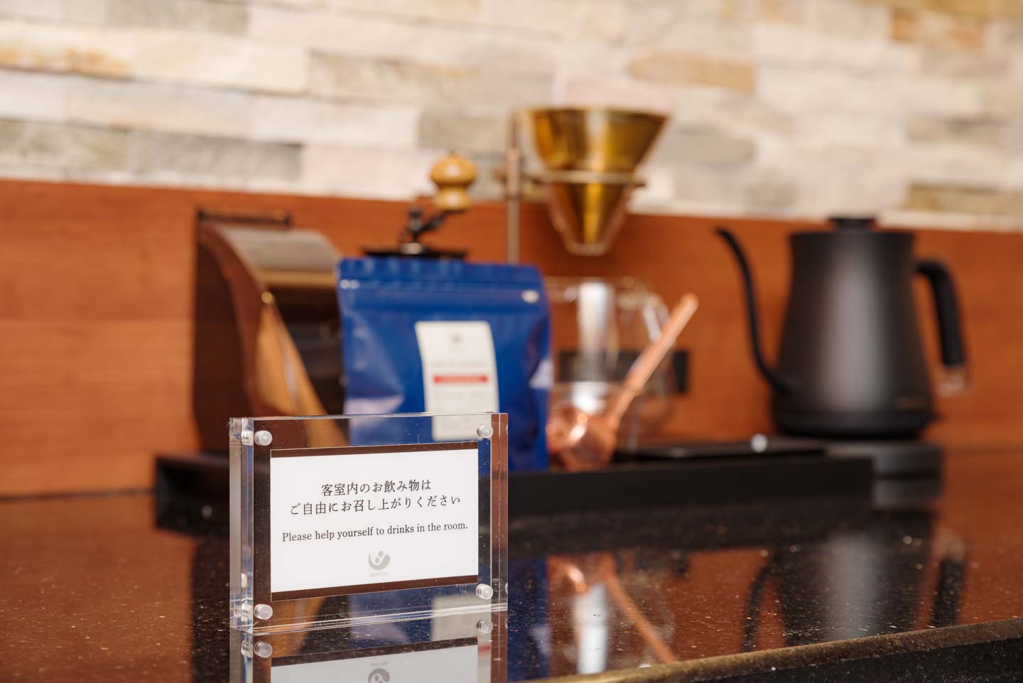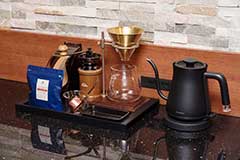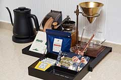 珈琲カウンターにご用意しました珈琲豆(静楓亭オリジナルパッケージ)、冷凍・冷蔵庫内のお酒・ドリンク類を、オールインクルーシブでお楽しみいただけます。(※ご宿泊費に含む)