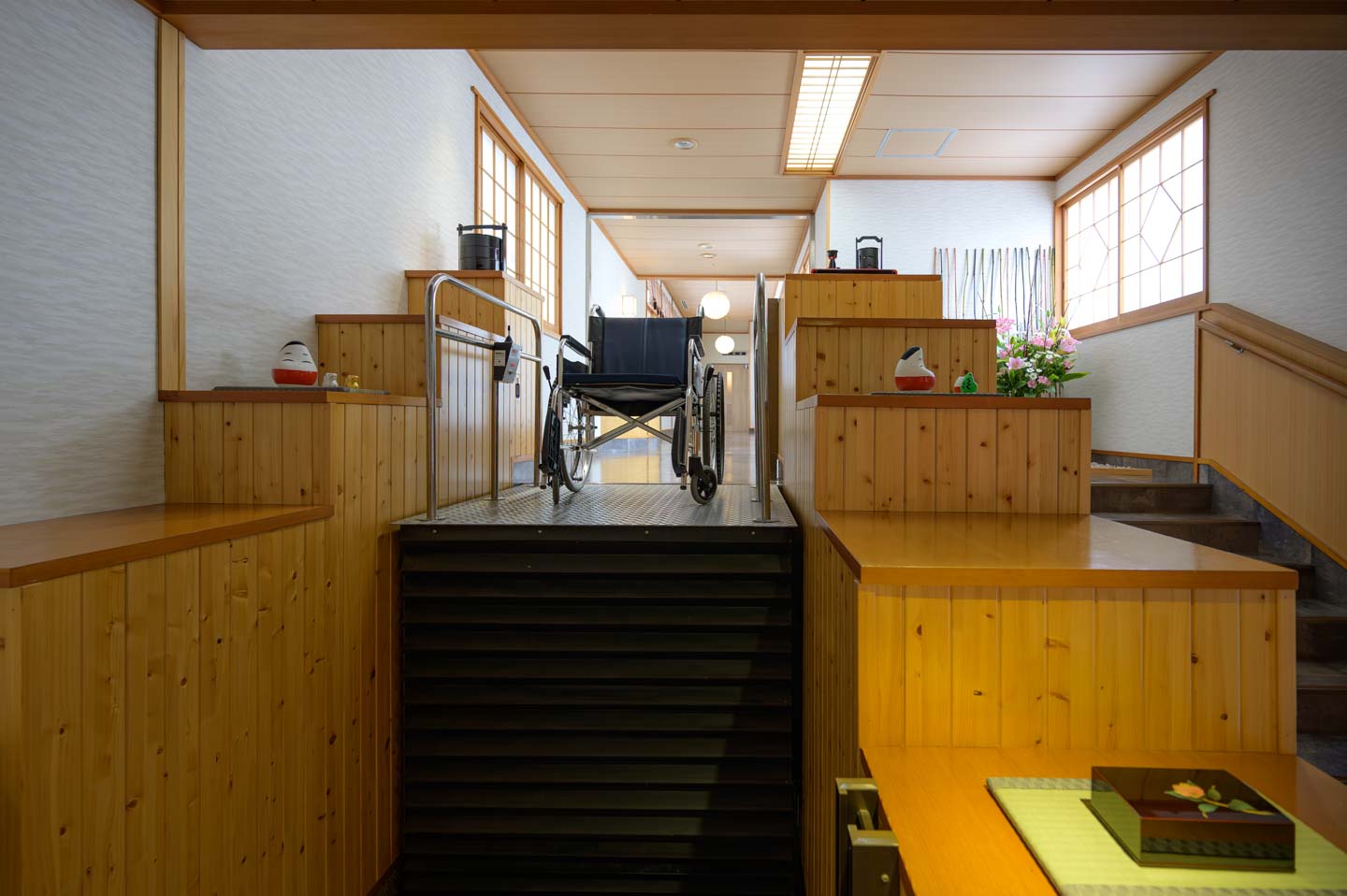 車椅子の方だけでなく付き添いの方も含めてご滞在中はお客様みなさまの負担をできる限り軽減したいという創業者の想いから、全館至るところへバリアフリー仕様の設計がなされており、エントランスの段差箇所にはスロープを設け、屋内の階段箇所に昇降機を設置、さらに客室と露天風呂に至るまでバリアフリーの設備を備えております。