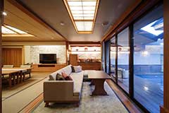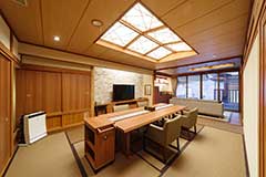 客室専用露天風呂を臨む平屋造りの「露天風呂付レギュラースイート(約102㎡)」は、全8室。リビング・ダイニング(12畳)に、寝室(10畳)の二間をご用意しました。寝具は基本、和布団(※)となります。