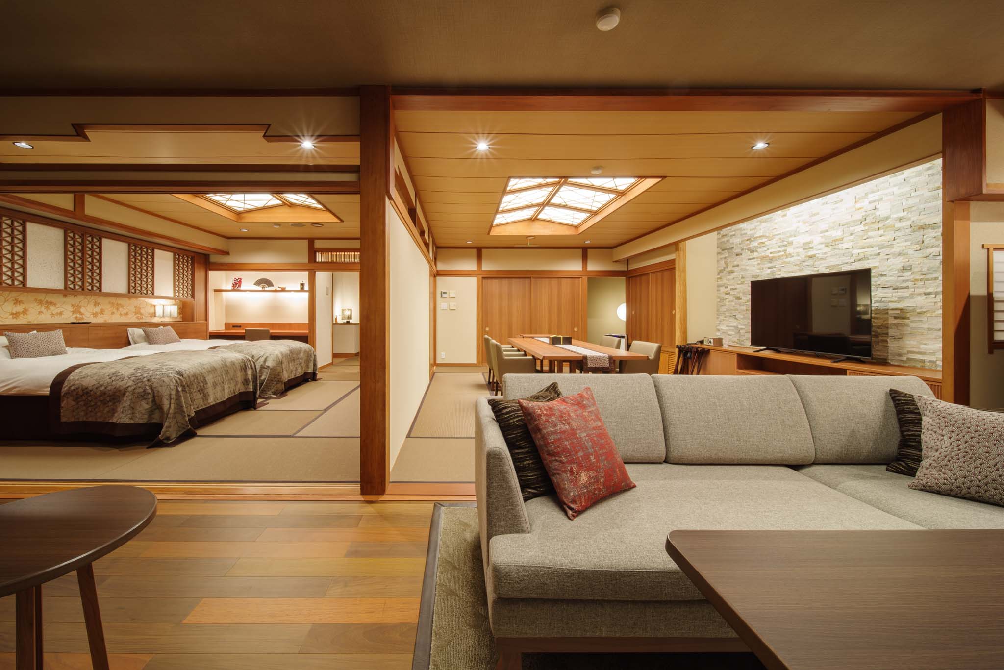 静楓亭の客室(全11室)は、それぞれ総面積102㎡。寝室、ダイニングの広々とした二間に、ダイニングから続くリビング、そしてドレスルームやセパレートのトイレ、内風呂、さらに源泉かけ流し7.3畳(約12㎡)の広い露天風呂を備える、寛ぎと癒やしのスイートです。