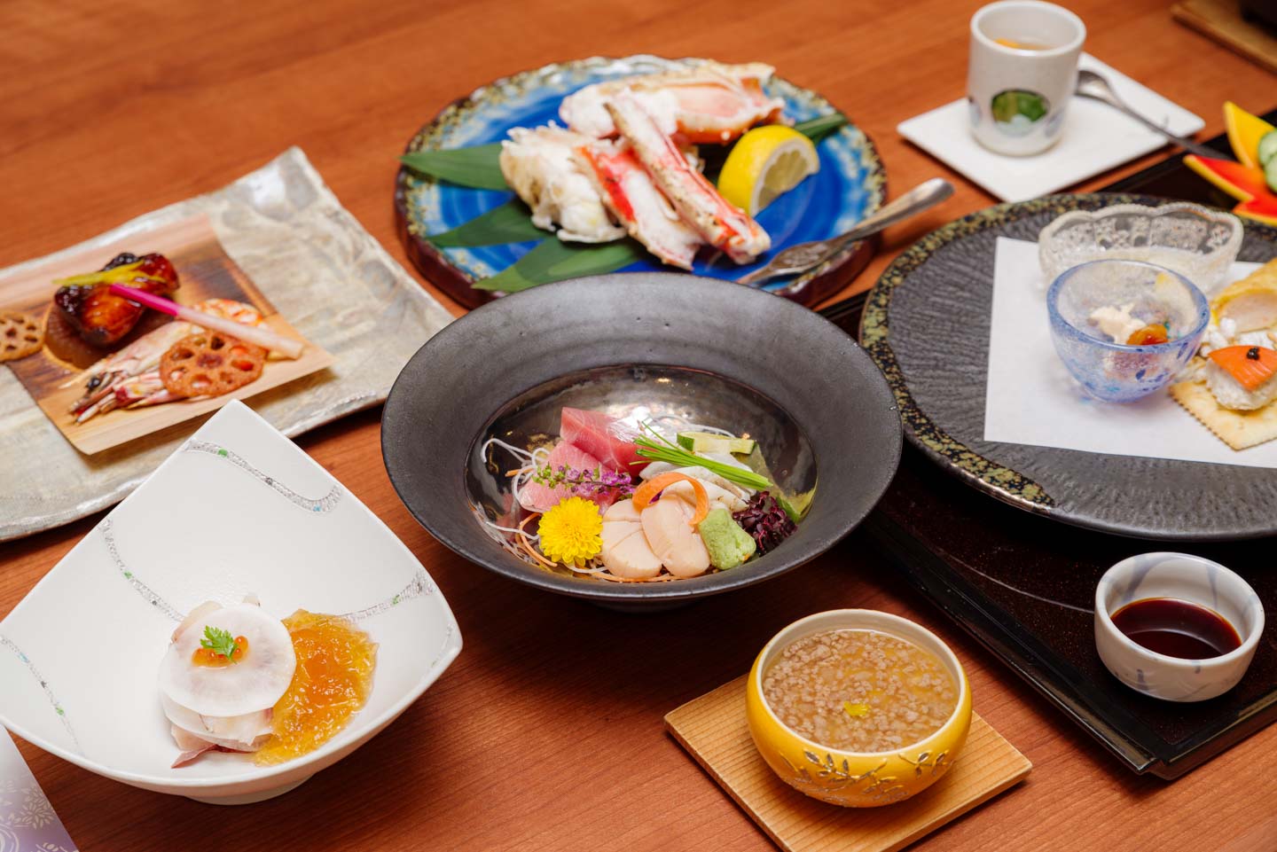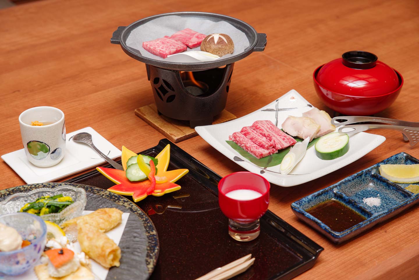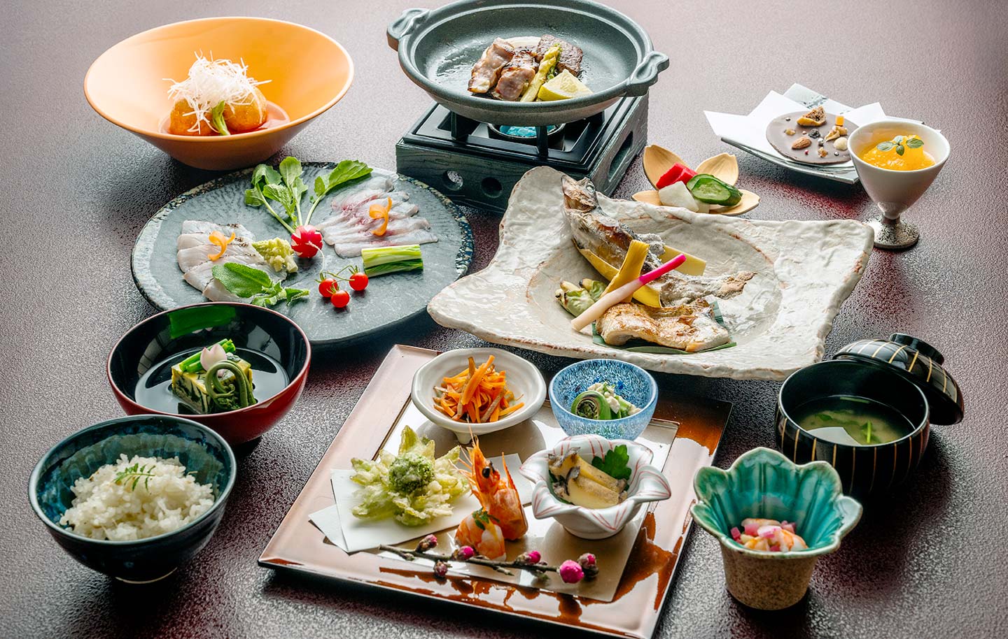 ローカル⾷材をふんだんに使った静楓亭の「⾥⼭会席料理」。