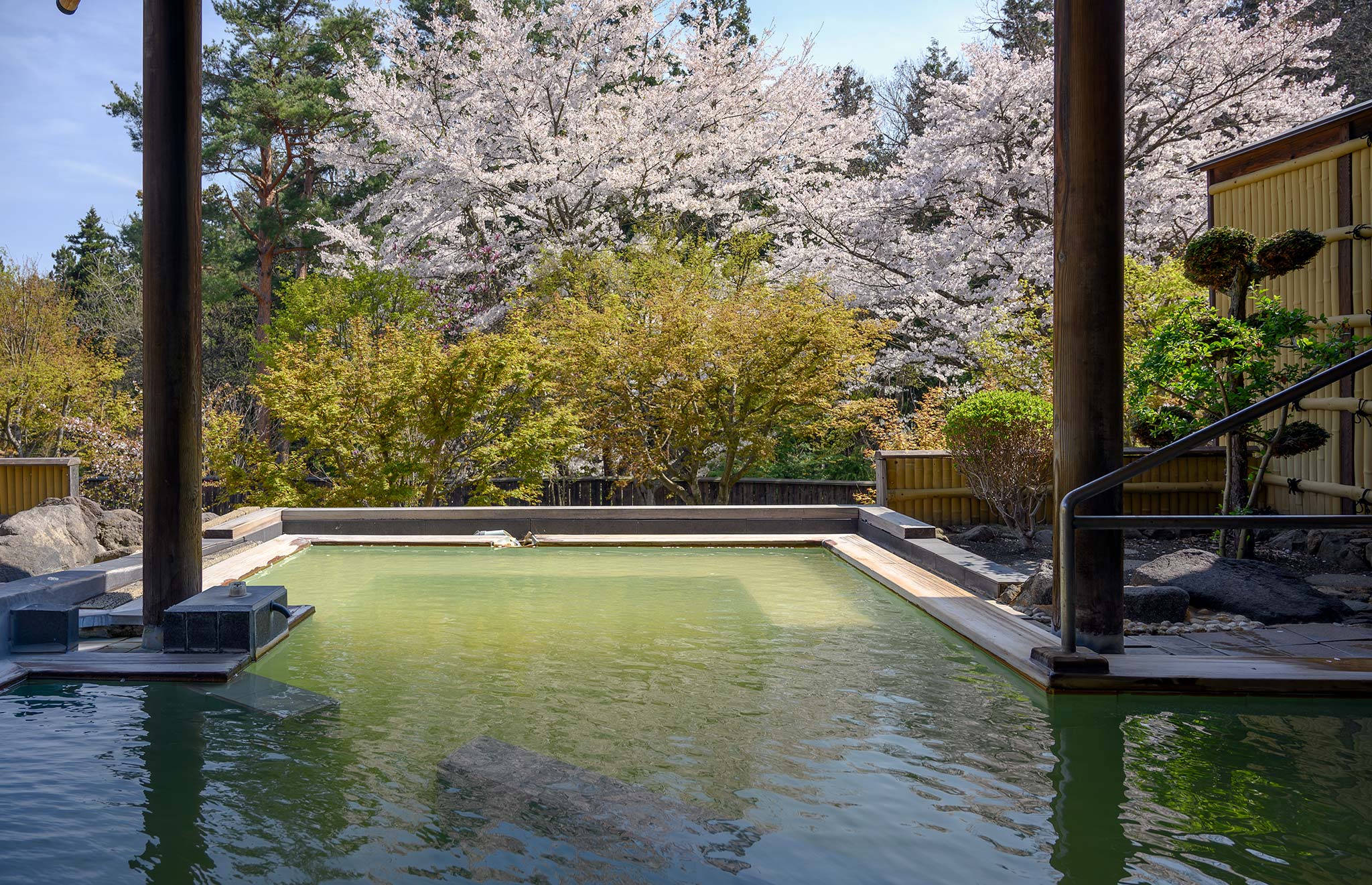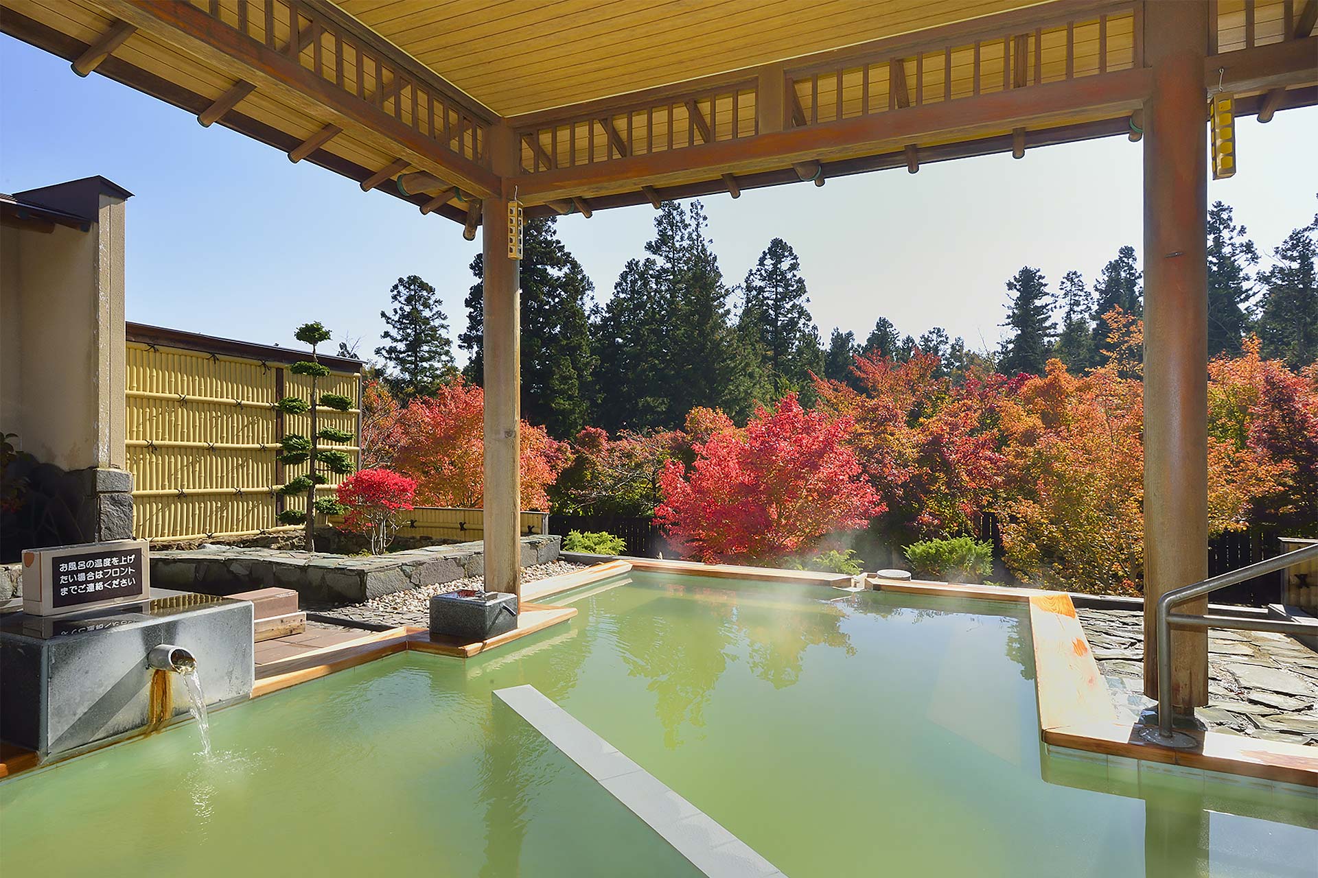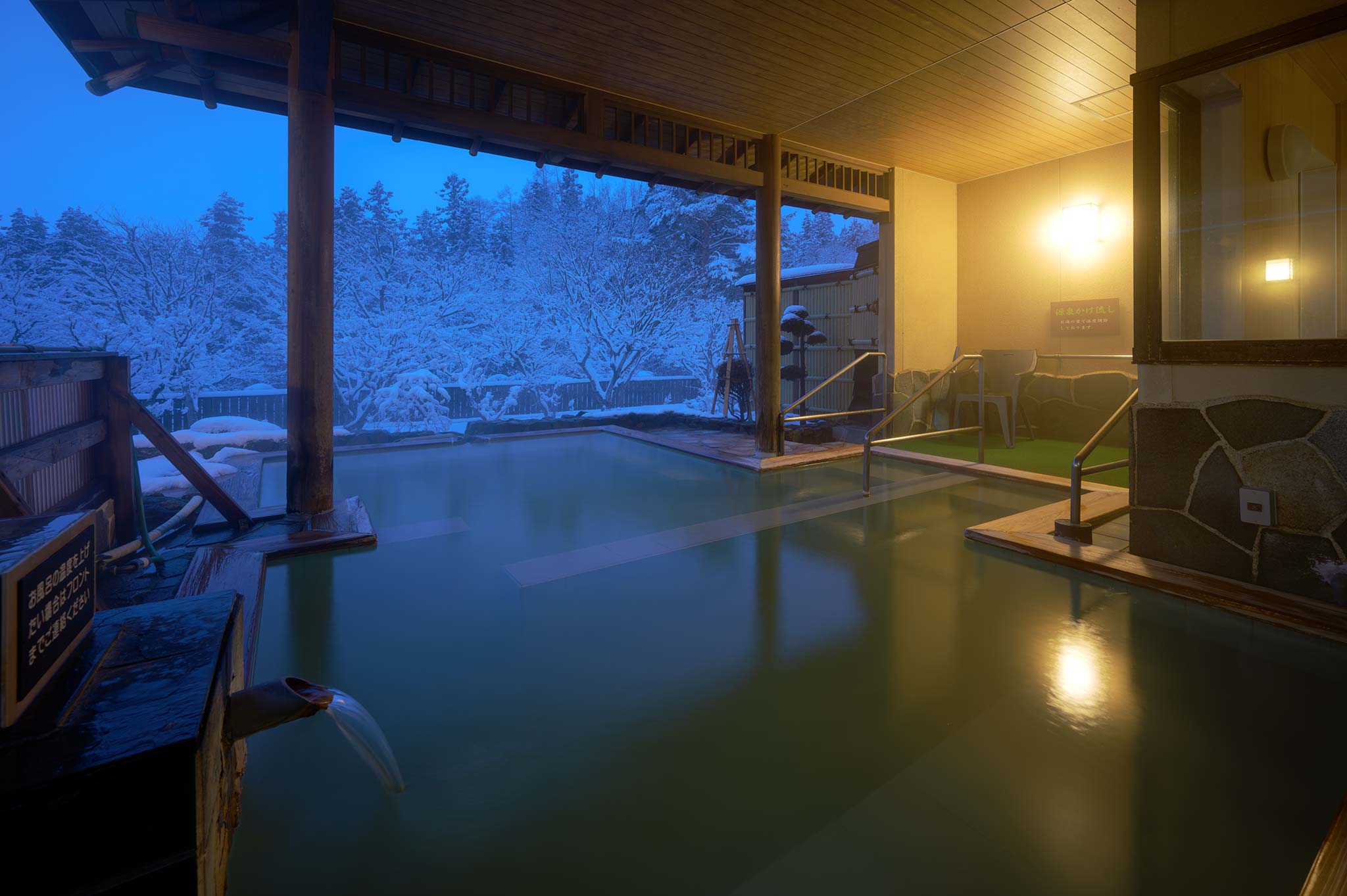 露天風呂は、湯船面積7.3畳相当(約12㎡)と圧巻の広さに、豊かな湧出量を誇る「磐梯山麓温泉」の源泉かけ流し天然温泉です。