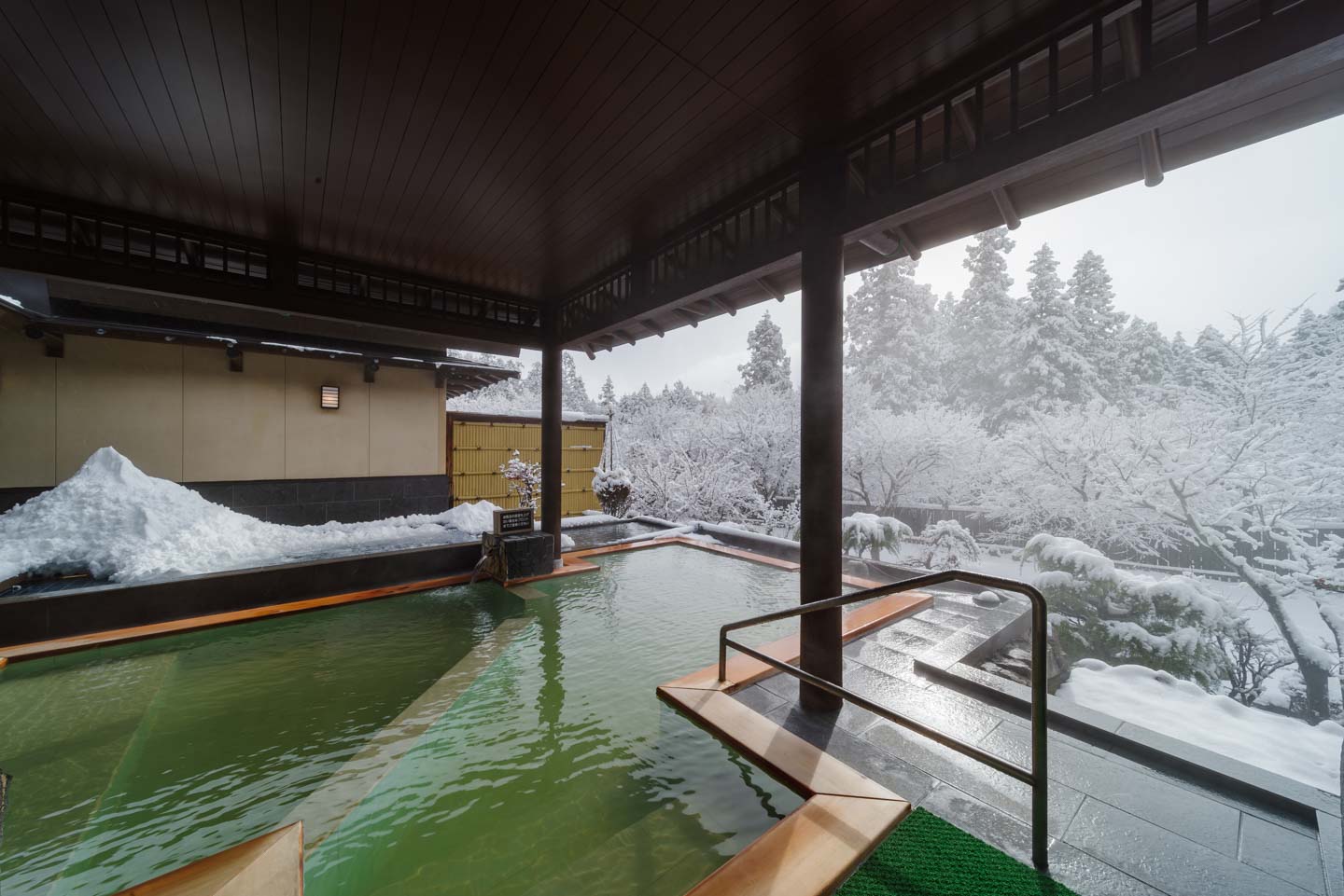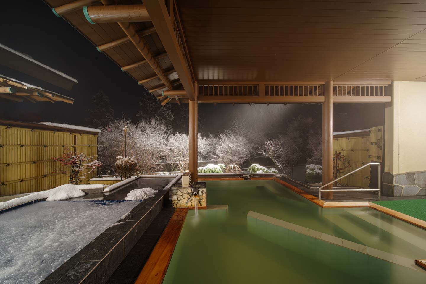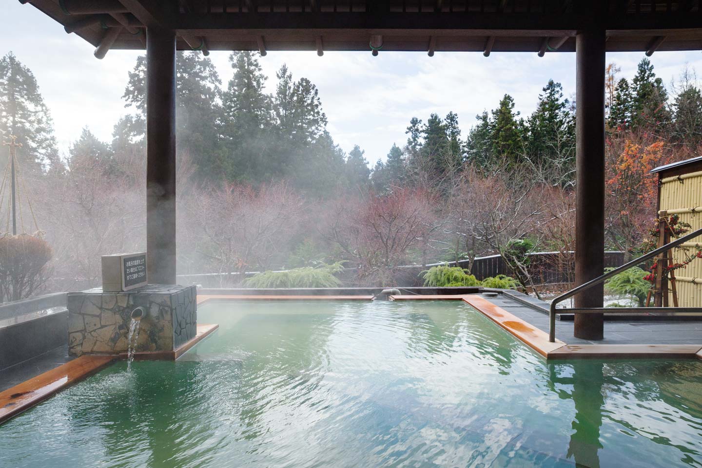 露天風呂は、湯船面積7.3畳相当(約12㎡)と圧巻の広さに、豊かな湧出量を誇る「磐梯山麓温泉」の源泉かけ流し天然温泉です。